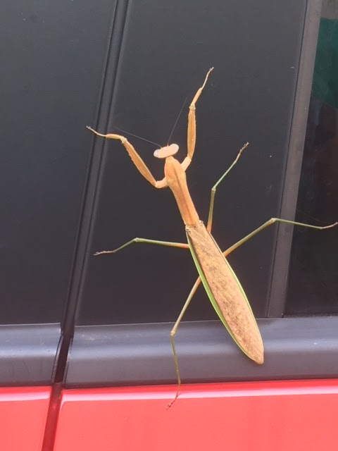 Yesterday I was with our oldest daughter Sarah as she was moving into her new house. We were at the storage facility where her worldly possessions were being loaded by movers to be taken to her new home. I went over to my car to get a drink of iced coffee I had left there. As I went to open the door there was a huge praying mantis right by the handle. I jumped back – insects make me nervous